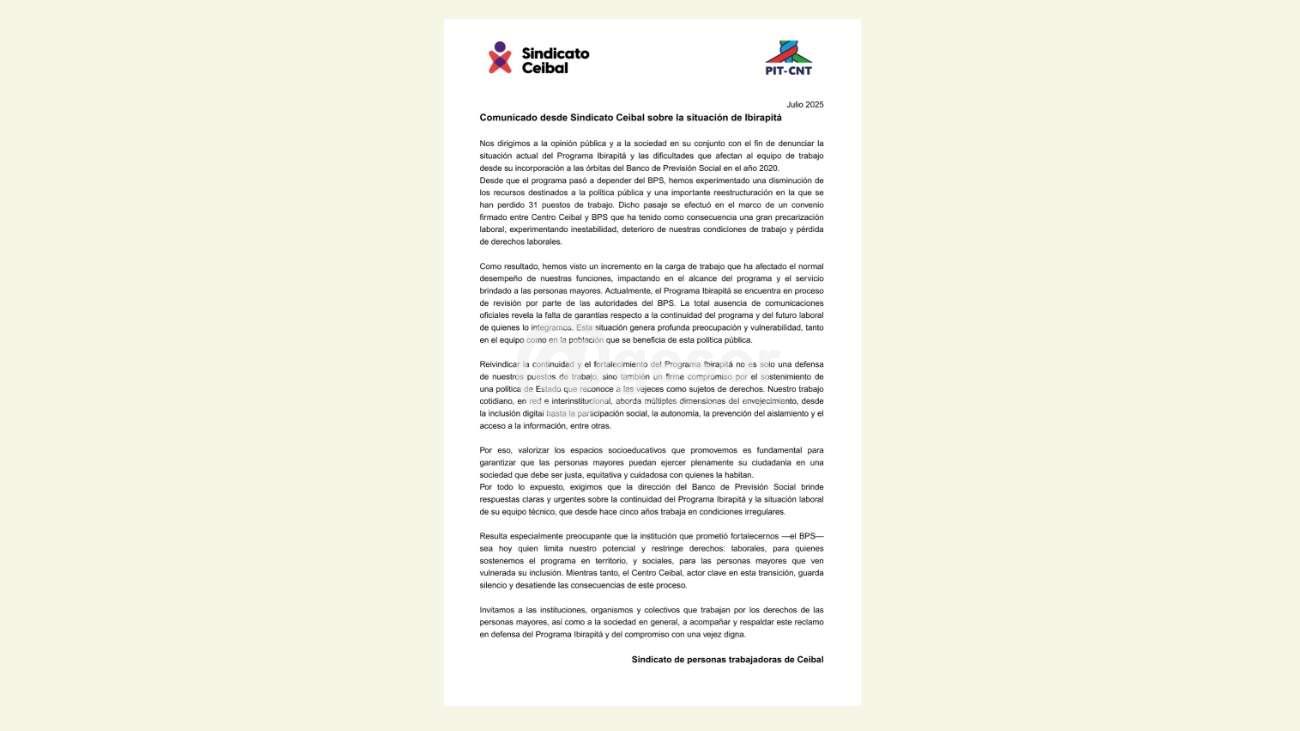 Actualmente, el Programa Ibirapitá está en proceso de revisión por parte del BPS, sin comunicaciones oficiales que garanticen su continuidad ni la estabilidad laboral del equipo técnico. Esto genera profunda preocupación y vulnerabilidad.