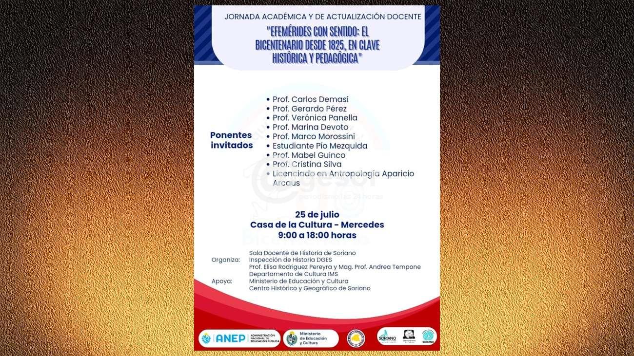 En Casa de la Cultura de Mercedes se realizará un evento educativo de gran relevancia el próximo 25 de julio, con la realización de la "Jornada Académica y de Actualización Docente: Efemérides con sentido: El Bicentenario desde 1825, en clave histórica y pedagógica". La actividad, que se desarrollará entre las 9:00 y las 18:00 horas, promete ser un espacio enriquecedor para docentes y público interesado en la historia y la pedagogía.