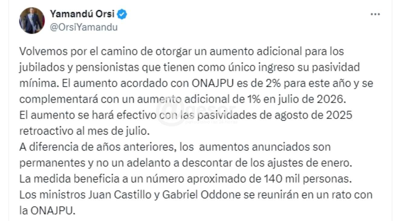 “Volvemos por el camino de otorgar un aumento adicional para los jubilados y pensionistas que tienen como único ingreso su pasividad mínima”, expresó el presidente Yamandú Orsi, en su cuenta en la red social X.