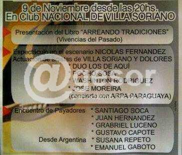 Este sábado se realiza un encuentro de payadores en Club Nacional de Villa Soriano organizado por Jesús Bonti. Durante el mismo se realizará la presentación de su segundo libro titulado "Arreando Tradiciones (Vivencias del pasado)".