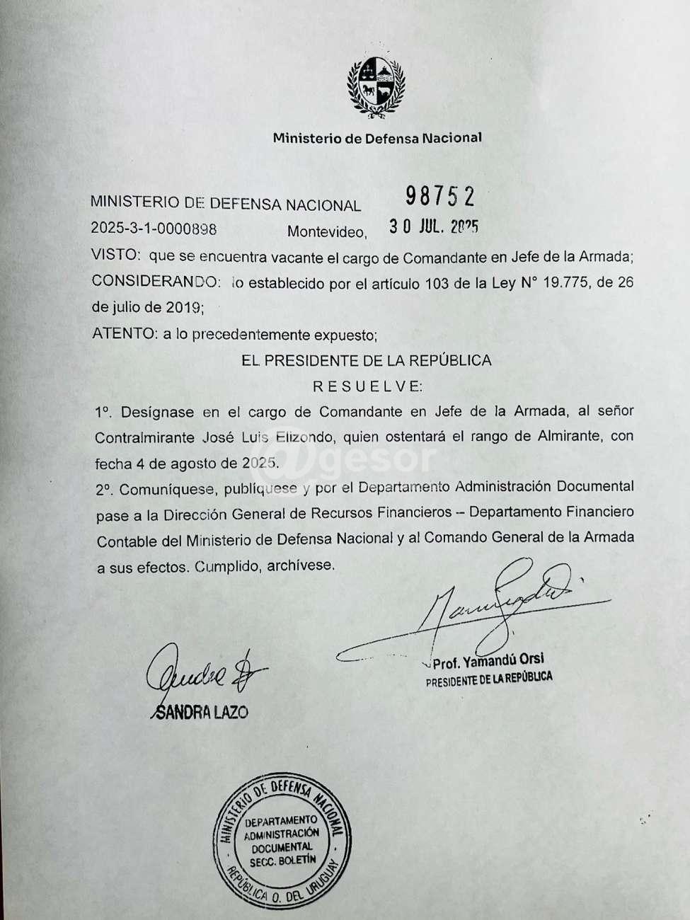 El Ministerio de Defensa Nacional informó que el Poder Ejecutivo ha resuelto designar al Contralmirante José Luis Elizondo como nuevo Comandante en Jefe de la Armada.