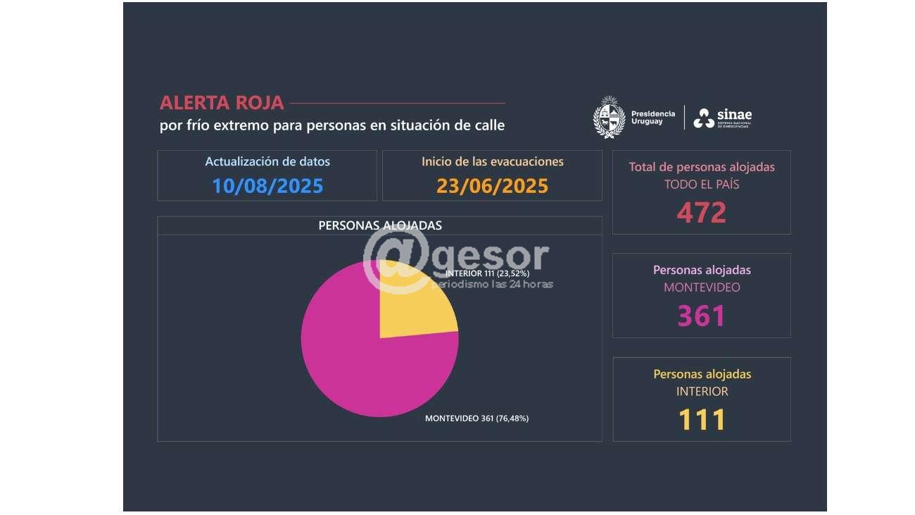 A 48 días de declarada la alerta pública de nivel rojo por temperaturas extremas para personas y animales en situación de calle, el operativo coordinado por el Sinae atendió a 2.191 personas en refugios y 472 en centros de evacuación.
