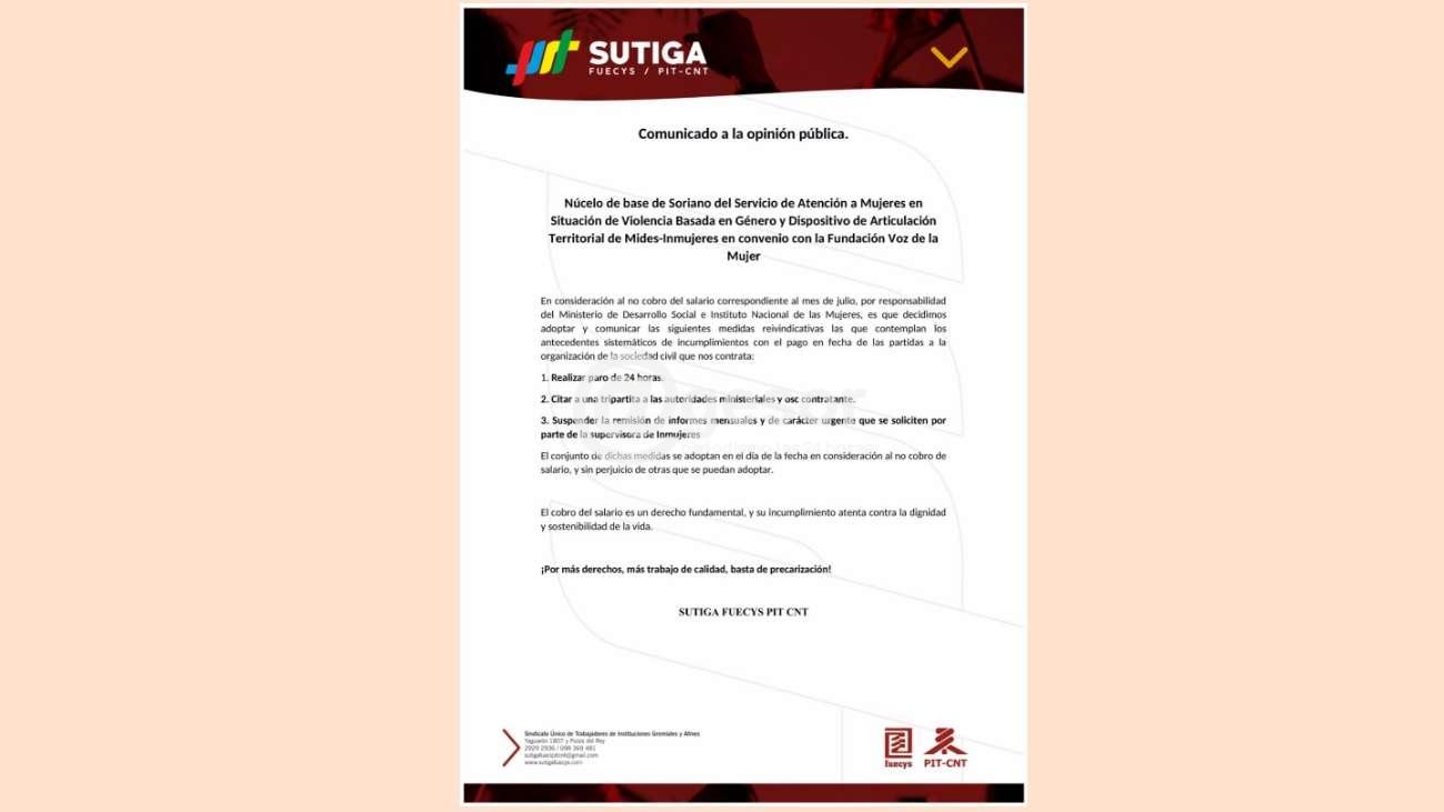 En consideración al no cobro del salario correspondiente al mes de julio, por responsabilidad del Ministerio de Desarrollo Social e Instituto Nacional de las Mujeres, es que decidimos adoptar y comunicar las siguientes medidas reivindicativas las que contemplan los antecedentes sistemáticos de incumplimientos con el pago en fecha de las partidas a la organización de la sociedad civil que nos contrata: