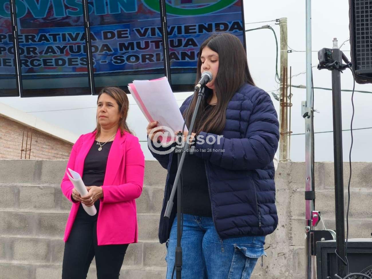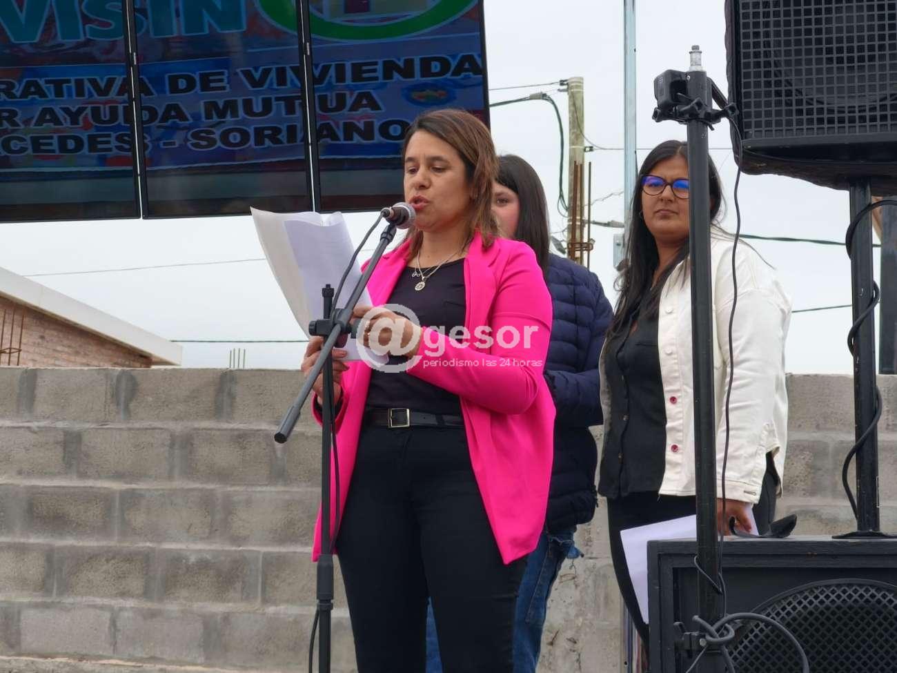 A continuación, Ashelen Cáceres integrante de la cooperativa señaló, "estamos aquí hoy sábado 16 de agosto de 2025 en el padrón catastral 11107 de la ciudad de Mercedes, del departamento de Soriano, situado en Diego Lamas y Artigas, para la inauguración de la cooperativa que aquí se construyó, la Cooperativa de Vivienda Sindical C.