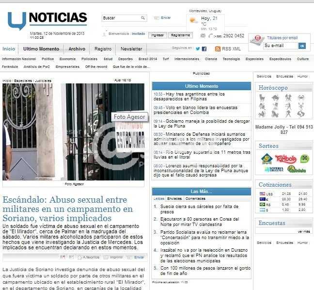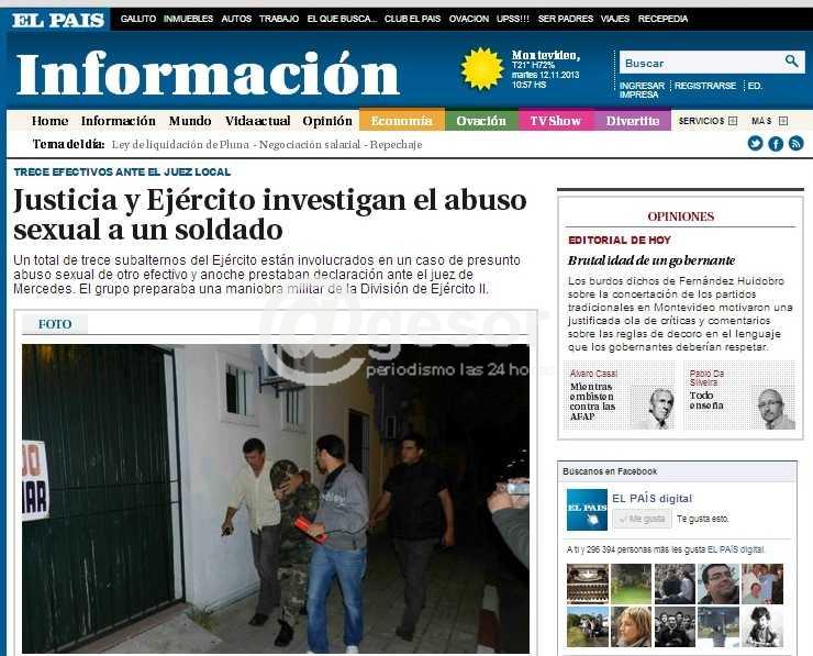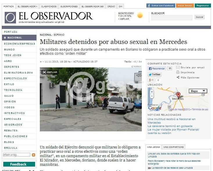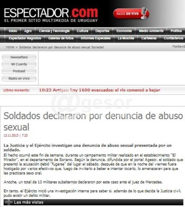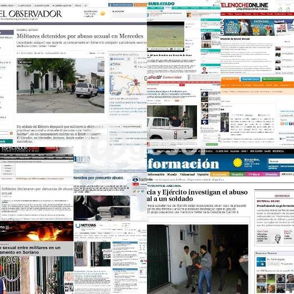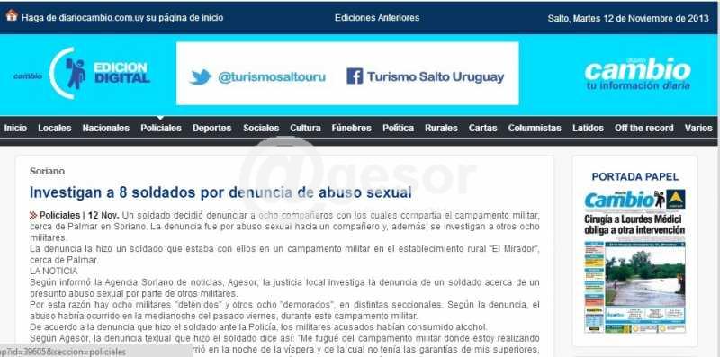 Amplia repercusión ha tenido la noticia sobre el abuso sufrido por un militar en el campamento montado cerca de Palmar. Desde que ayer a la tarde @gesor difundió este caso al publicar la denuncia del militar víctima de este abuso, el tema comenzó a repercutir en los principales medios de comunicación de la región y de la capital del país. Al punto que a las pocas horas eran escasos los medios de comunicación que no habían reproducido parcial o totalmente lo informado por nuestra agencia de noticias, comenzando a delegar periodistas para cubrir las novedades que pudieran surgir.