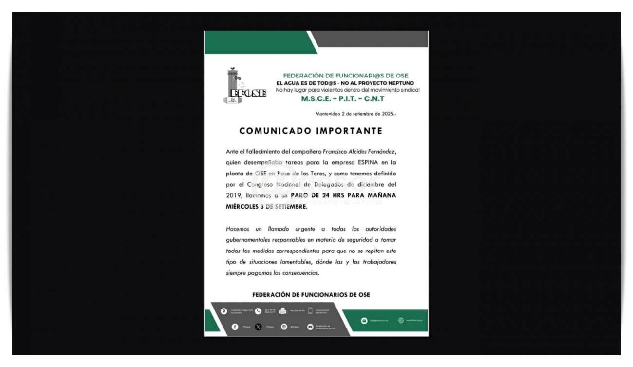 Ante el fallecimiento del compañero Francisco Alcides Fernández, quien desempeñaba tareas para la empresa ESPINA en la planta de OSE en Paso de los Toros, y como tenemos definido por el Congreso Nacional de Delegados de diciembre del 2019, llamamos a un PARO DE 24 HRS PARA MAÑANA MIÉRCOLES 3 DE SETIEMBRE.