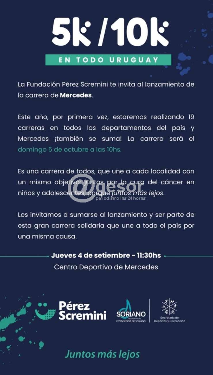 La Fundación Pérez Scremini estará realizando las carreras 5K y 10K en todo el Uruguay. El lanzamiento en Mercedes se lleva a cabo este jueves 4 a las 11.30 horas en el Centro Deportivo Mercedes y la carrera será el domingo 5 de octubre a las 10.00 horas.