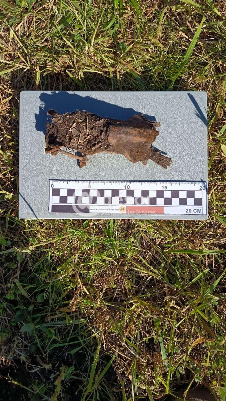 Fueron halladas además, escamas de bronce que pertenecen al barboquejo de un chacó (gorro que usaban los oficiales de las tropas regulares).