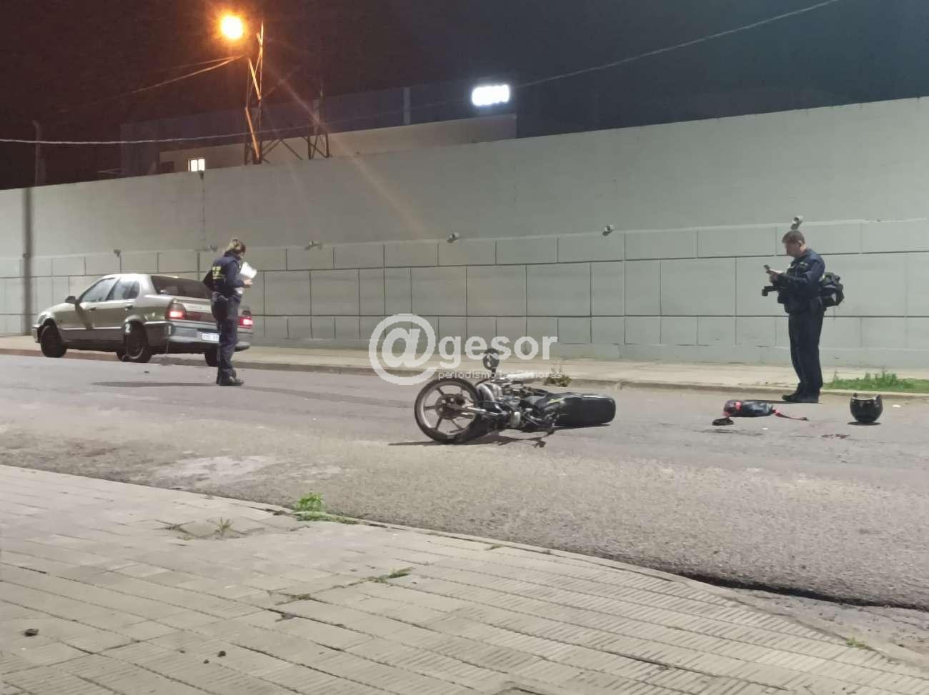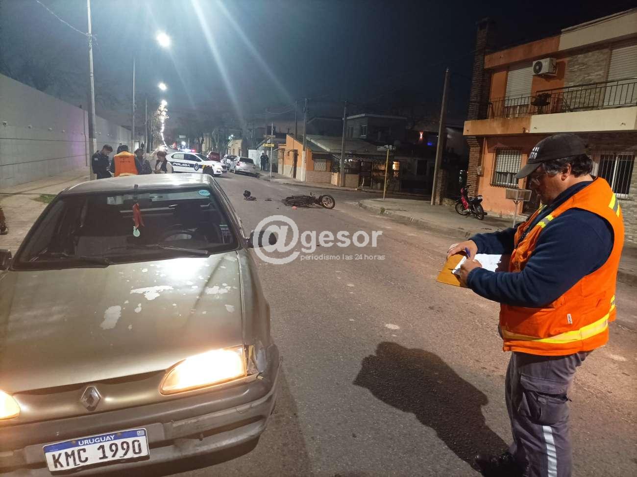 Siniestro de tránsito se producjo en la noche de este martes en la zona de avda. Fregeiro casi Gomensoro, cuando por Fregeiro de Oeste a Este circulaba el automóvil Renault 19 matrícula KMC 1990 conducido por un masculino mayor de edad y en sentido contrario por Fregeiro de Este a Oeste lo hacía la moto matrícula KNB 490 guiada por un masculino mayor de edad también.