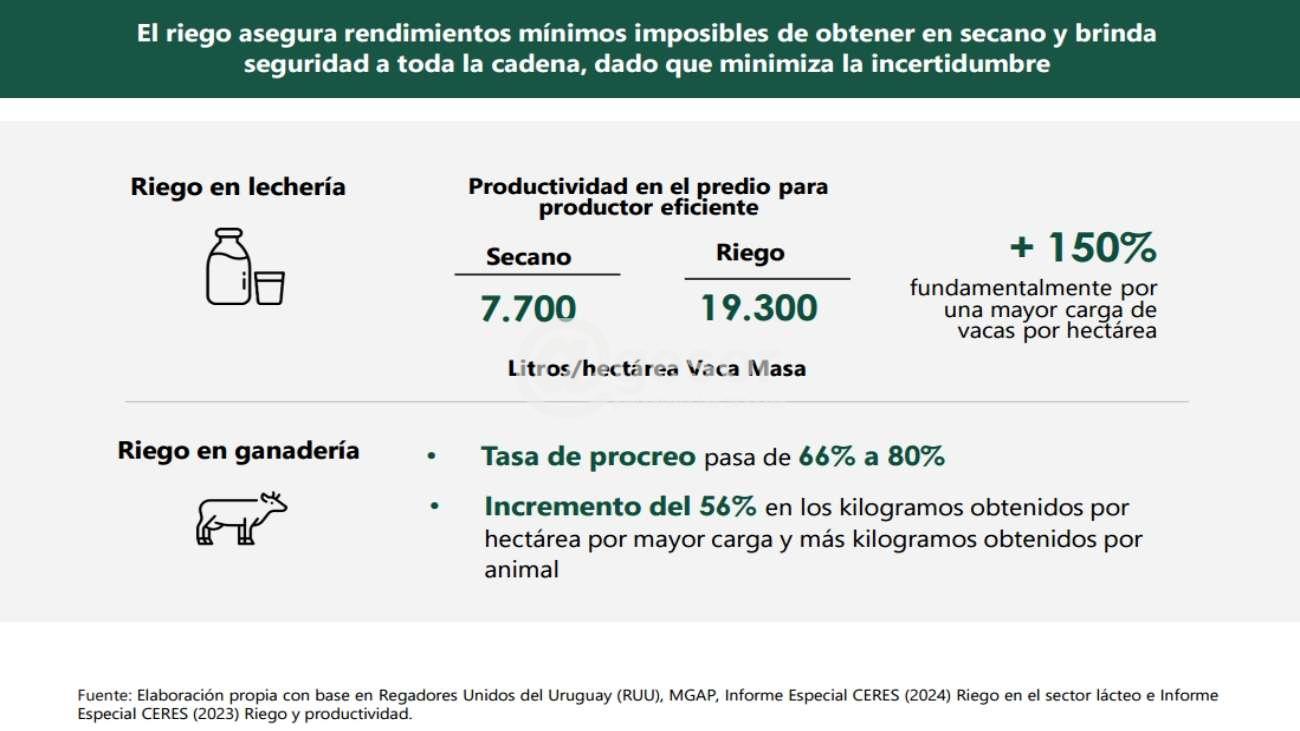 Actualmente se riegan menos de 100 mil hectáreas en Uruguay en actividades que utilizan riego suplementario. El informe muestra que los incrementos de productividad son contundentes: en promedio para las últimas cosechas, el riego eleva los rendimientos de maíz en 73% y 38% para la soja; puede lograr un incremento de la producción lechera de hasta 150% por hectárea y un aumento significativo en la producción de carne. Con base en entrevistas a informantes calificados y en datos disponibles, CERES concluye que es técnica y ambientalmente sostenible y alcanzable expandir el riego a más de 500 mil hectáreas entre cultivos de verano (maíz y soja), ganadería y lechería. De lograrse este objetivo, se estima un impacto económico anual de al menos USD 3.300 millones, equivalente a 3,5% del PIB, además de mayores niveles de inversión, empleo y recaudación por mayor producción (estimado en USD 60 millones al año) y más consumo de energía eléctrica (aproximadamente USD 100 millones al año).
