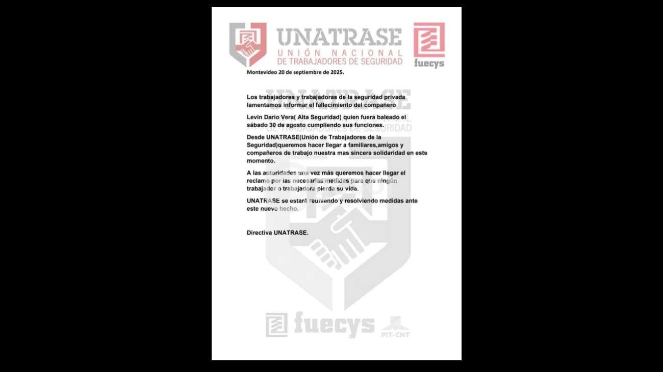 Los trabajadores y trabajadoras de la seguridad privada lamentamos informar el fallecimiento del compañero Levín Darío Vera (Alta Seguridad) quien fuera baleado el sábado 30 de agosto cumpliendo sus funciones.
