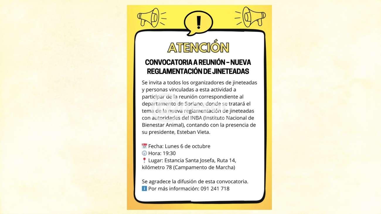 Recibimos y publicamos: Se invita a todos los organizadores de jineteadas y personas vinculadas a esta actividad a participar de la reunión correspondiente al departamento de Soriano, donde se tratará el tema de la nueva reglamentación de jineteadas con autoridades del INBA (Instituto Nacional de Bienestar Animal), contando con la presencia de su presidente, Esteban Vieta.