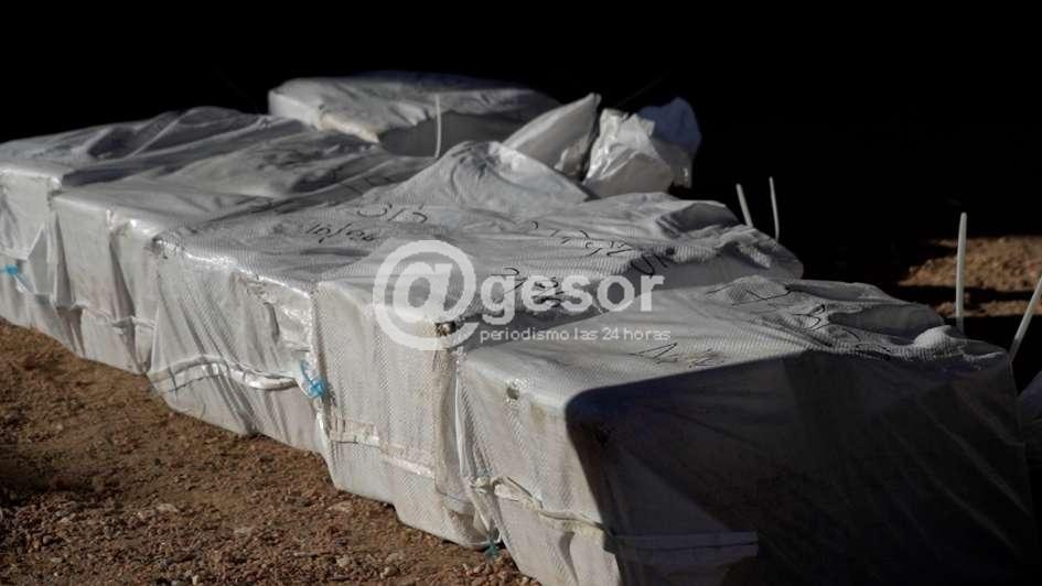 Durante la inspección del galpón del predio, se constató tierra removida en una parte del suelo. Al excavar, se hallaron paquetes ocultos cubiertos con chapas, madera y tierra. Todos estaban envueltos en film y almacenados en bolsos náuticos de color negro.
