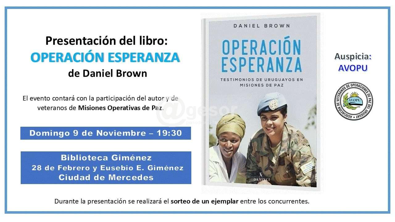 El domingo 9 de noviembre a las 19.30 horas, en Biblioteca Eusebio Giménez, ubicada en 28 de Febrero y Giménez de Mercedes, se realizará la presentación del libro "Operación Esperanza" de autoría de Daniel Brown.