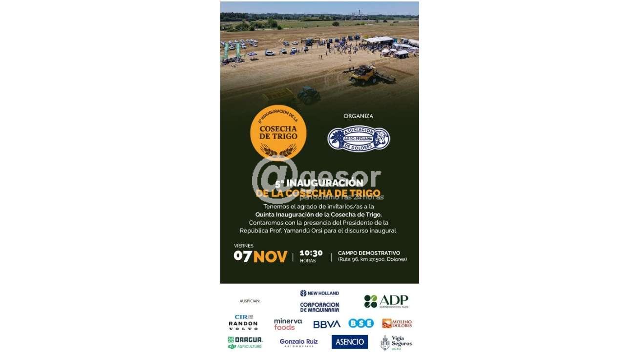 La Asociación Agro-Pecuaria de Dolores organiza la quinta edición de la Inauguración de la Cosecha de Trigo, que se realizará el viernes 7 de noviembre a las 10:30 horas en el Campo Demostrativo, ubicado en Ruta 96, kilómetro 27.500.