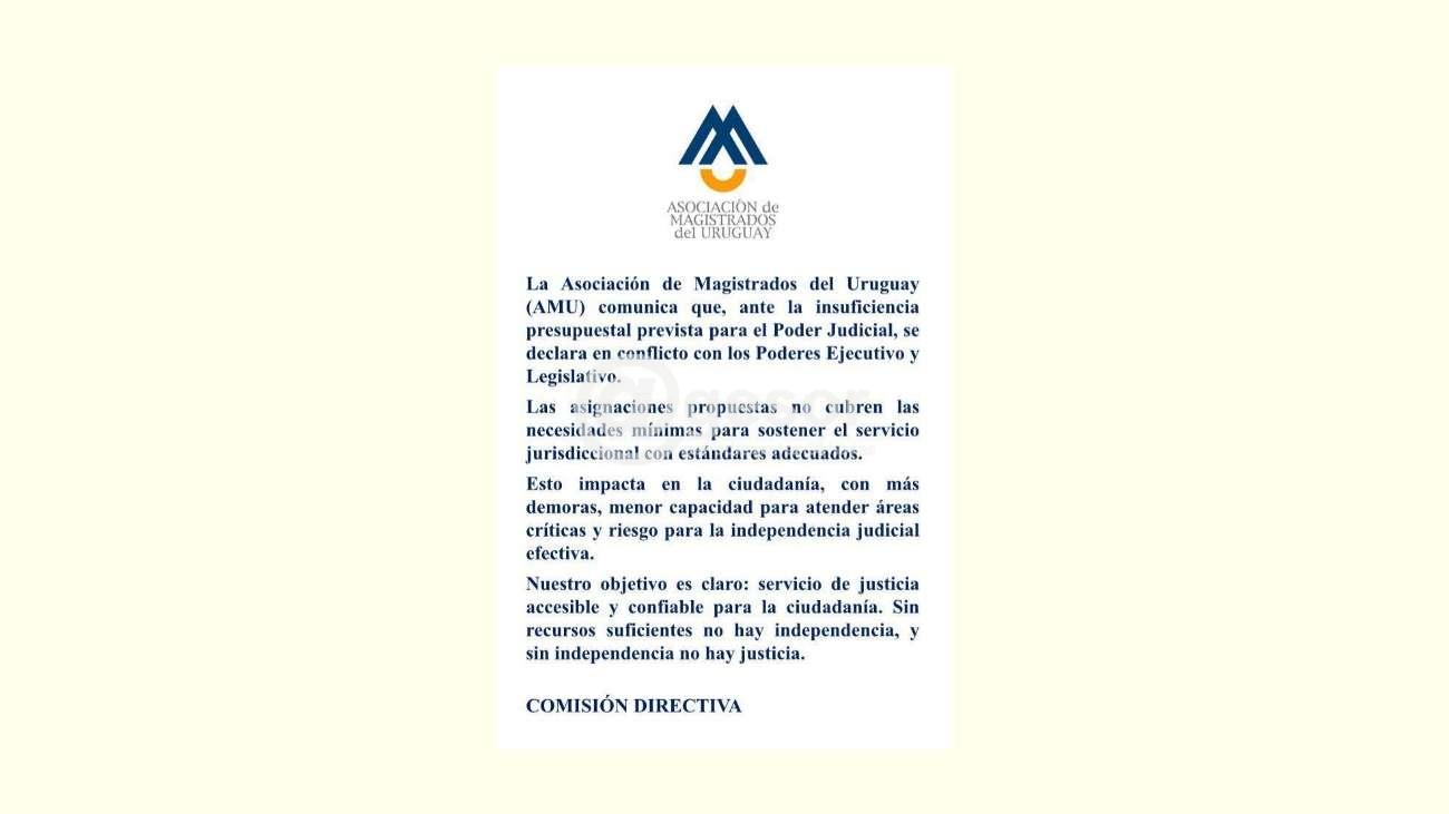 La Asociación de Magistrados del Uruguay (AMU) comunica que, ante la insuficiencia presupuestal prevista para el Poder Judicial, se declara en conflicto con los Poderes Ejecutivo y Legislativo.