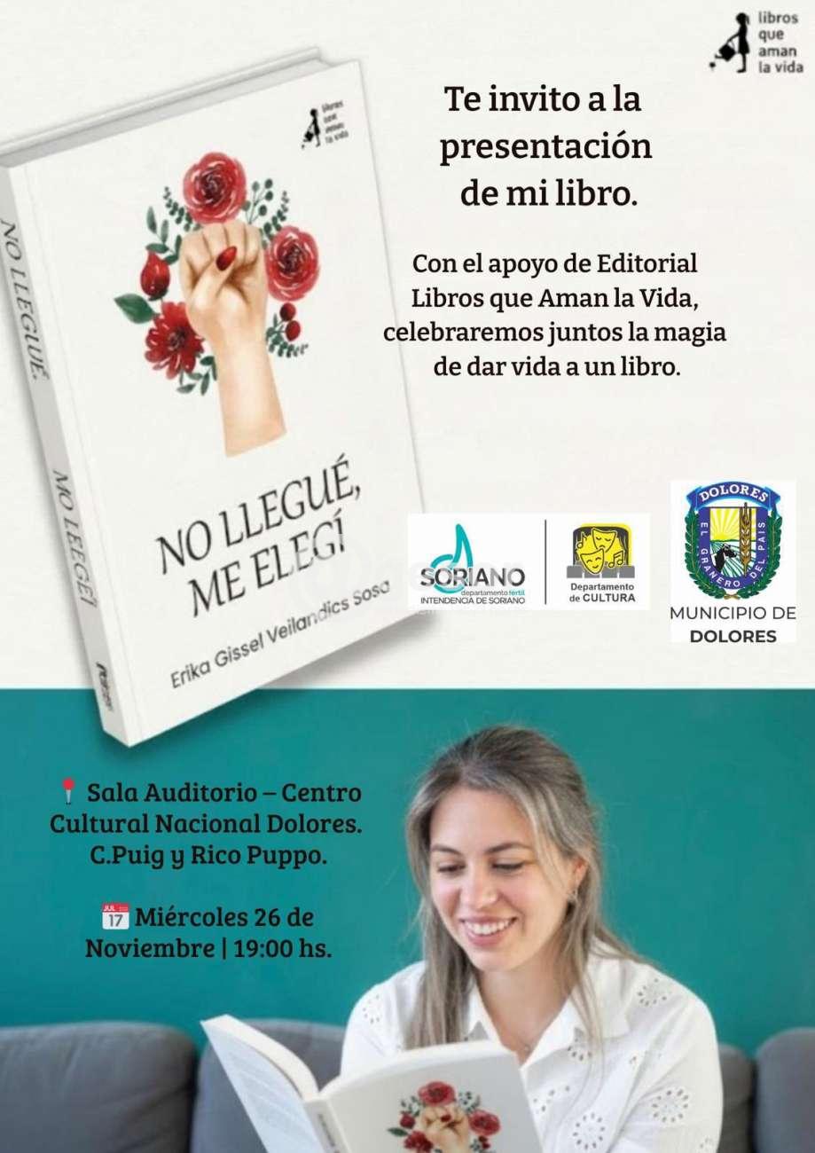 El miércoles 26 de noviembre a las 19.00 horas estará presentándose el libro "No llegué, me elegí", de la autoría de Erika Gissel Veilandics Sosa en el auditorio del Centro Cultural Nacional de Dolores.