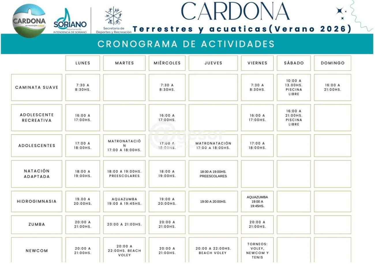 La Intendencia de Soriano, a través de la Secretaría de Deportes y Recreación, informa el cronograma de actividades terrestres y acuáticas disponibles para el Verano 2026.
