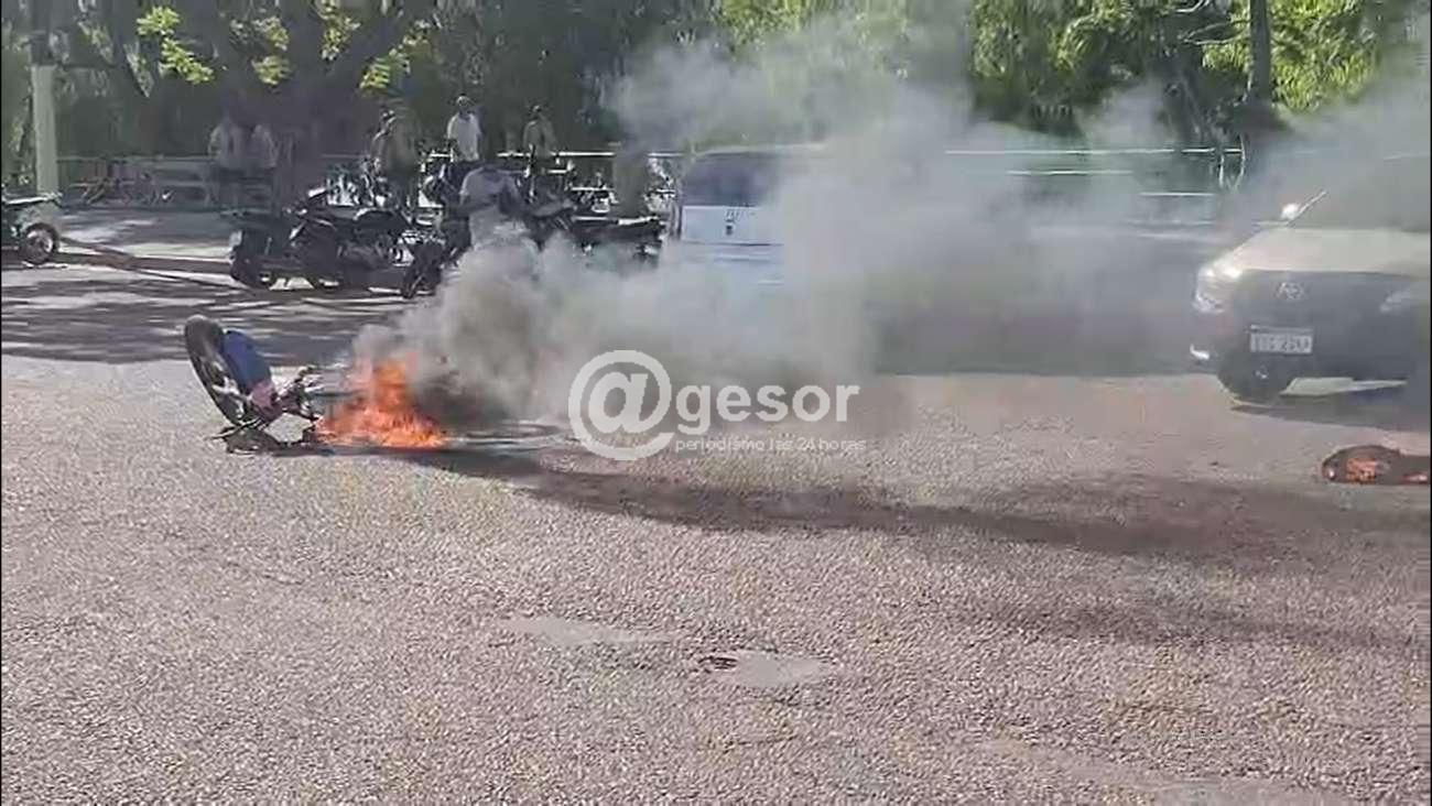 De acuerdo a las versiones primarias recogidas en el lugar, la moto venía perdiendo combustible por la manguera y la alta temperatura más alguna chispa encendió el foco ígneo que llevó a que prácticamente tomara fuego gran parte del vehículo, siendo sofocado el incendio por parte de la dotación de Bomberos que se hizo presente, no habiendo personas heridas ni lesionadas.