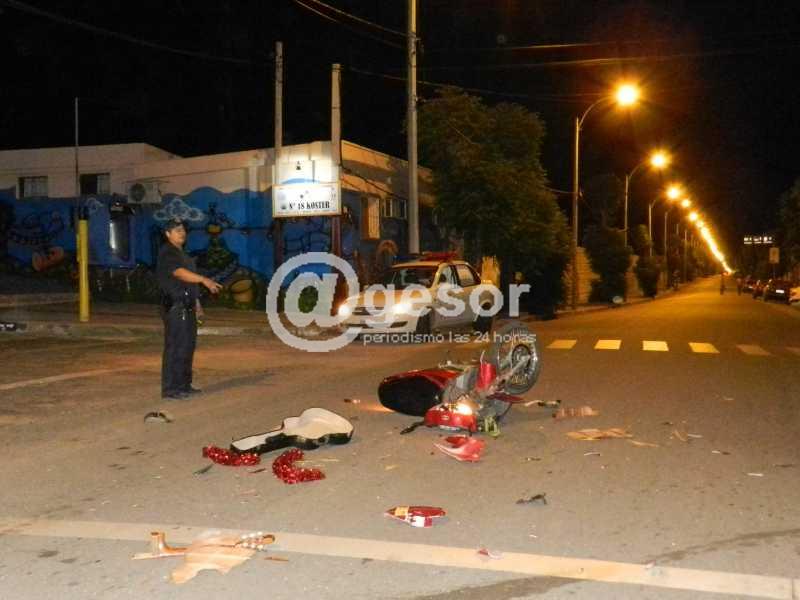 Poco antes de la 4.00 de la madrugada de este domingo ocurrió accidente de tránsito en la intersección de avda. Fregeiro y Herrero y Espinosa, donde entraron en colisión un automóvil de color gris que circulaba por la primera de Oeste a Este y una moto Yumbo Max 110 cc matrícula KMY 142 propiedad de María Florencia Viera Rosso, que era conducida por Joaquín Abel Pedernera Viera de 21 años y llevaba como acompañante a otro joven, quienes lo hacían por Espinosa de Norte a Sur.