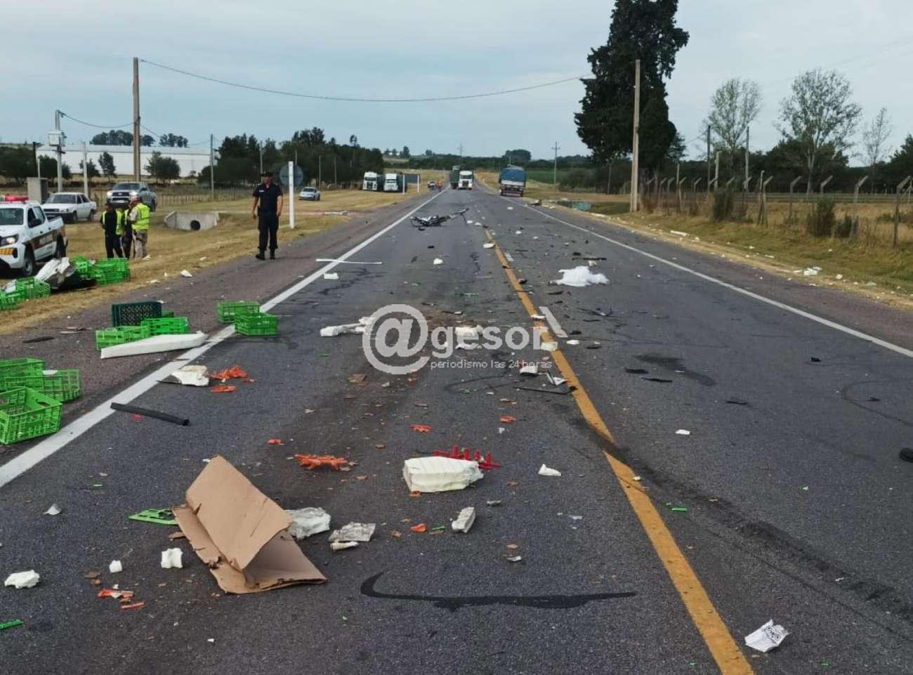 De acuerdo a la información que pudo recoger @gesor el camión Mercedes Benz matrícula IAD 1758 circulaba por Ruta 21 rumbo a Mercedes, cuando en sentido contrario lo hacía el camion Hyundai matrícula LAF 8773 el que por motivos que se investigan se cruzó de senda alcanzando a impactar en la parte trasera del Mercedes Benz, tras lo cual el conductor del Hyundai pierde el dominio del mismo y vuelca sobre el pavimento, a la vez que detrás del Hyundai circulaba el camión Volkswagen matrícula HTP 2311 que a raíz del impacto entre los vehículos anteriores, un cajób saltó del Hyundai un cajón con la mercadería que transporteba el vehículo lo que golpeó el parabrisas.