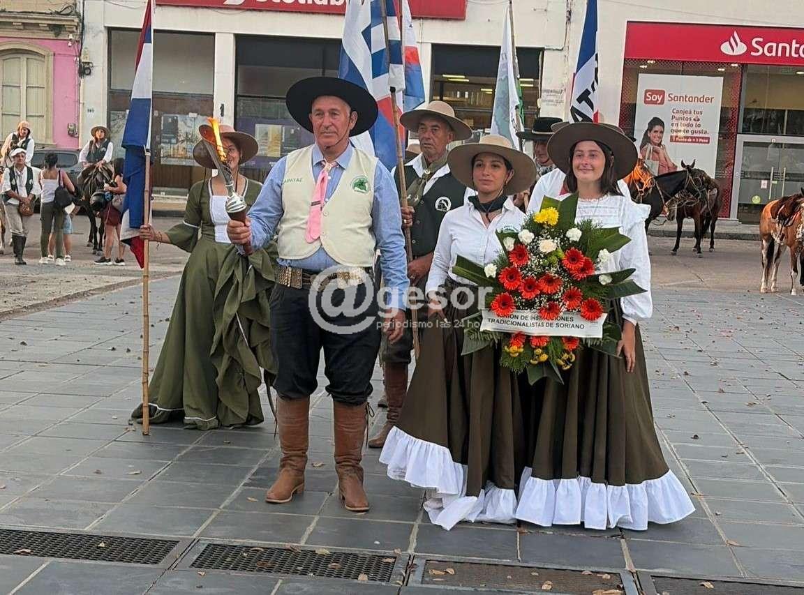 Arribada la marcha a la plaza, se procedió a cantar el Himno Nacional, y se depositó una ofrenda floral al pie del monumento al Gaucho de Asencio por parte de integrantes de aparcería del Cerro de Montevideo que fueron invitadas y acompañadas por las autoridades departamentales y de ls entidades organizadoras, para luego desconcentrar la caballada. A su vez Barufaldi realizó unos versos sobre la ocasión. Entre los marcheros puedo apreciarse al Intendente de Soriano, Guillermo Besozzi, al Alcalde de Dolores y Presidente del Plenario de Municipios Joaquín Gómez, Senador (s) José Luis Gómez, la Secretaria de Turismo Noemí Viera, exJefe de Policía Williams Martínez, entre otras personas que más allá de los cargos públicos que ocupan u ocuparon gustan de estas tradiciones y la practican habitualmente.