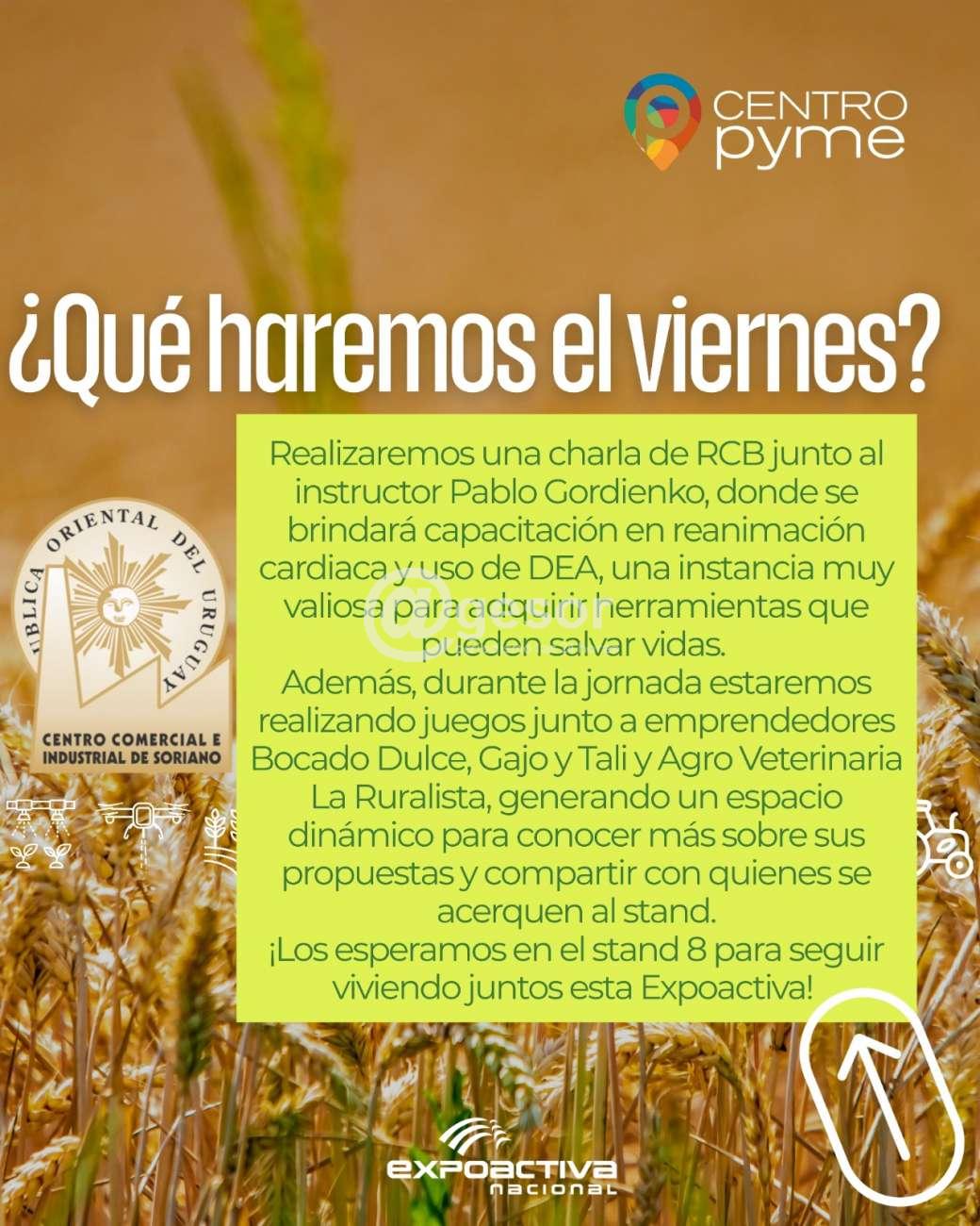 Durante la Expoactiva Nacional, el Centro Comercial e Industrial de Soriano y Centro Pyme estarán presentes con una agenda variada de propuestas. A lo largo de las jornadas se realizarán juegos y dinámicas para dar a conocer los servicios que ambas instituciones brindan diariamente, generando un espacio de intercambio con el público.