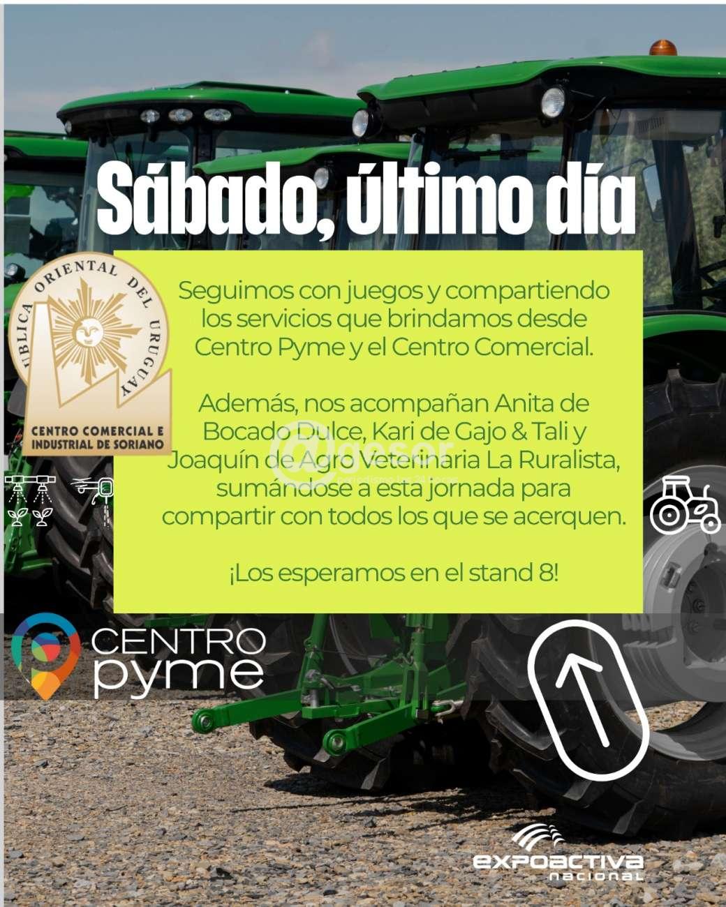 El Centro Comercial e Industrial de Soriano invita a todos los asistentes a acercarse al stand 8 para conocer sus servicios, participar de las charlas y disfrutar de las actividades programadas en esta nueva edición de Expoactiva Nacional.