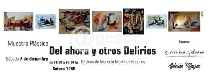 “Del ahora y otros delirios” se titula la muestra pictórica que se presentará el próximo sábado en las Oficinas de Marcelo Martínez Seguros, en Dolores. Esta muestra plástica reúne obras de Cristina Galeano y Adrián Meyer, y será habilitada al público a partir de las 21 horas, en Sotura 1268, Dolores.