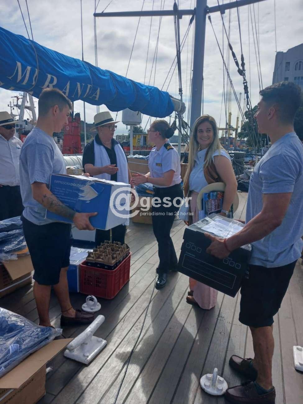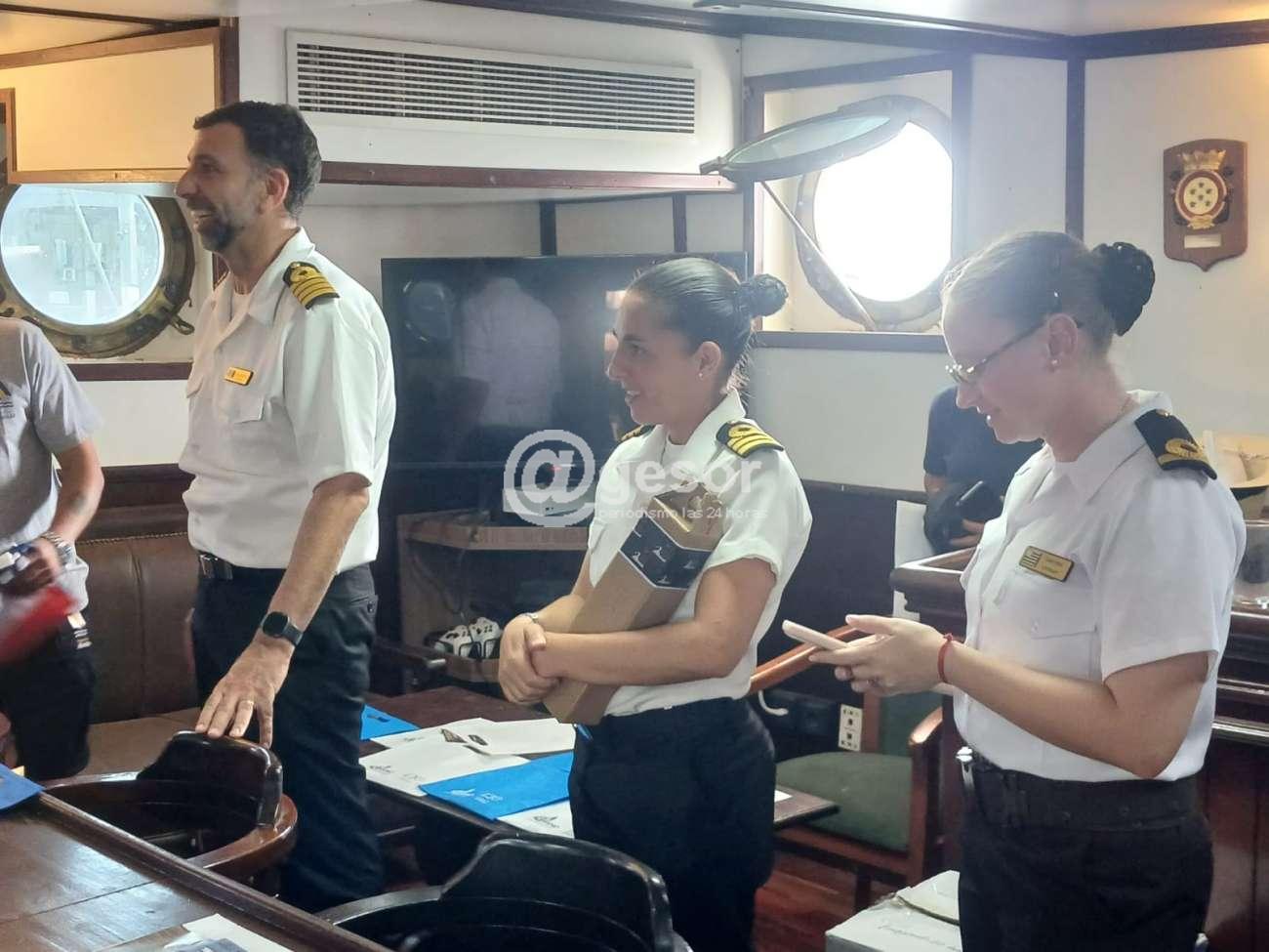 Participaron de la charla oficiales, suboficiales y marineros que componen la tripulación, al tiempo que se hizo entrega de dos banderas de Soriano a Rodrigo y a Agustín Sanguinetti, oriundos de Dolores que integran la tripulación, en un acto de reconocimiento a su participación en la travesía.