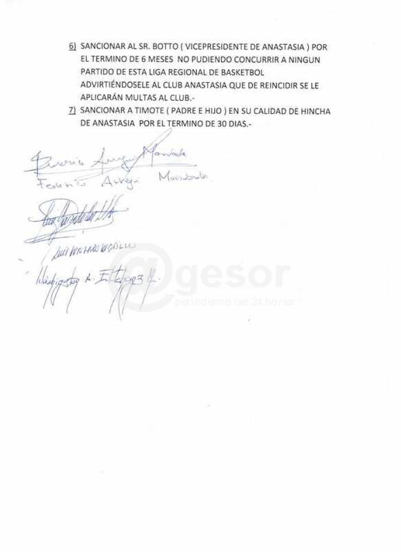 6) Sancionar al Sr. Botto (vicepresidente de Anastasia) por el término de 6 meses no pudiendo concurrir a ningún partido de esta Liga Regional de Basketbol, advirtiéndosele al Club Anastasia que de reincidir se le aplicarán multas al club.