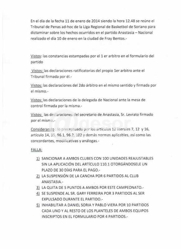 En el día de la fecha 11 de enero,siendo la hora 12:48 se reúne el Tribunal de Penas ad-oc de la Liga Regional de Basketbol de Soriano para dictaminar sobre los hechos ocurridos en el partido Anastasia-Nacional realizado el día 10 de enero en la ciudad de Fray Bentos.
