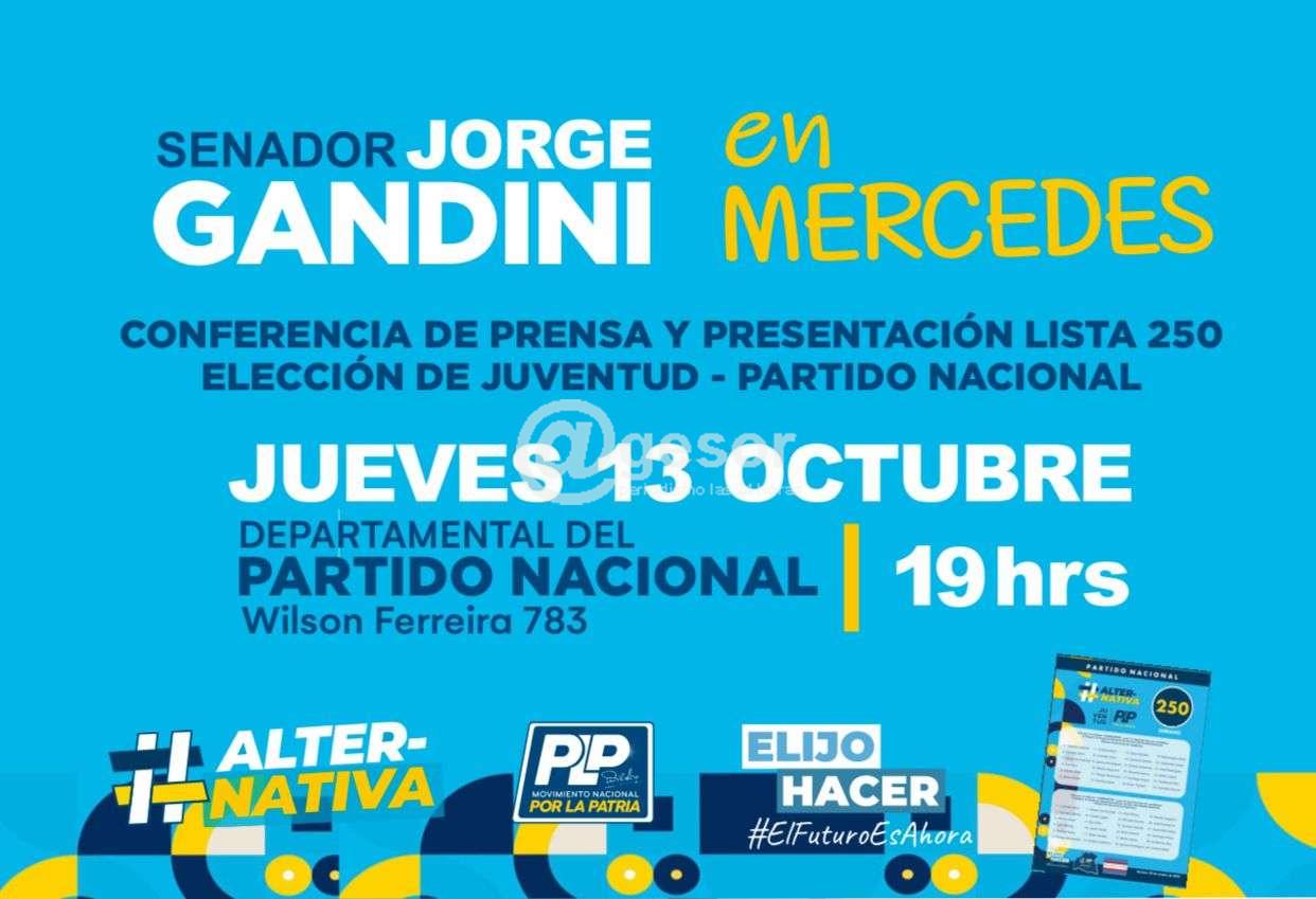 Este jueves 13 estará en Mercedes el Senador JORGE GANDINI con la finalidad de presentar la Lista 250 del Movimiento Por la Patria en conferencia de prensa, de cara a la participación en la Elección de la Juventud del Partido Nacional.
