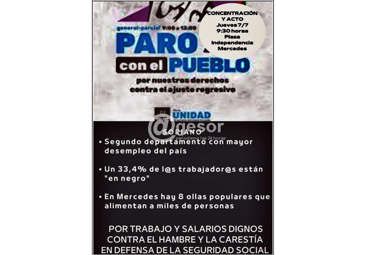 Este jueves 7 de julio el PIT CNT convocó para un Paro General parcial. Una medida que, con sus diferentes características, se aplicará en todos los departamentos. En Soriano la concentración se realizará en Plaza Independencia, a partir de las 9,30 hs para realizar un acto s...