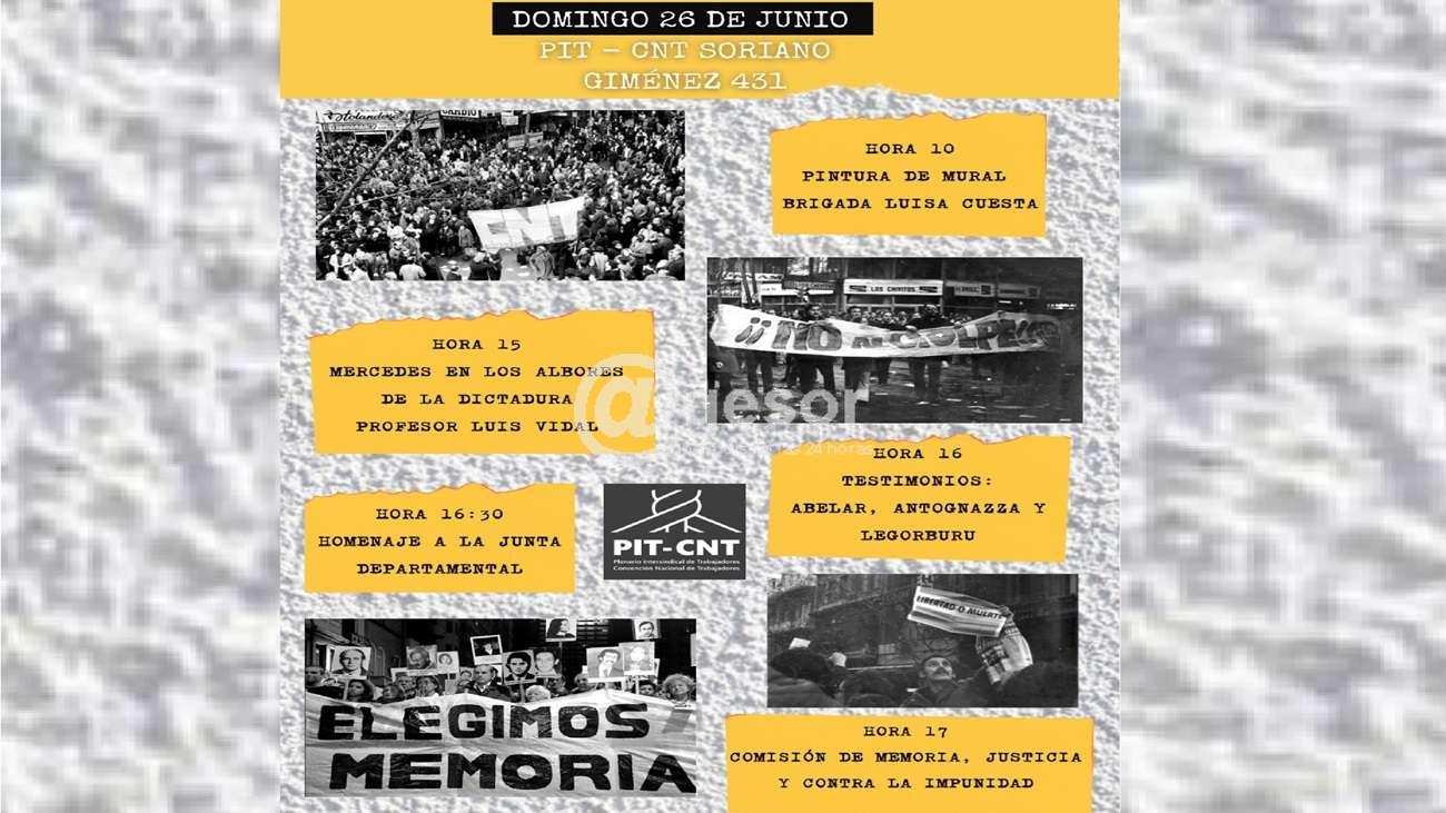 A 49 años del golpe de Estado, el Plenario Intersindical de Soriano realizará este domingo una jornada de reflexión y debate. La actividad comenzará a las 10 horas con la pintura de un mural, a cargo de la Brigada Luisa Cuesta.