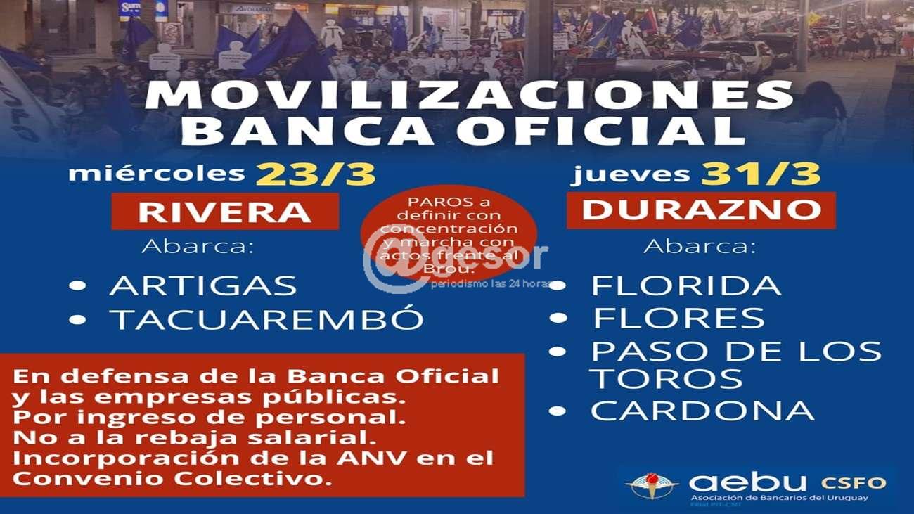 AEBU inicia una serie de movilizaciones a nivel nacional en defensa de la Banca oficial. Esta movilización comenzó en esta jornada en el norte del país (Artigas y Tacuarembó) y que continuará el 31 de marzo próximo en un grupo de localidades entre las que está Cardona.
