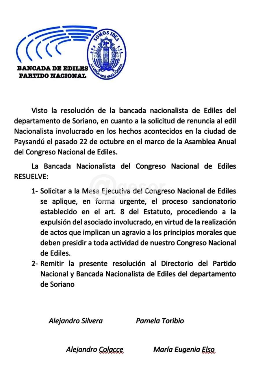 Ya cercano a la medianoche se conoció el pronunciamiento de la Bancada Nacionalista del Congreso Nacional de Ediles respecto del caso que involucra a dos ediles de Soriano en el que uno de ellos fue denunciado por "espiar" y presuntamente filmar a una edila de su mismo Partido Nacional y de la misma Lista, ambos de Soriano, cuan...