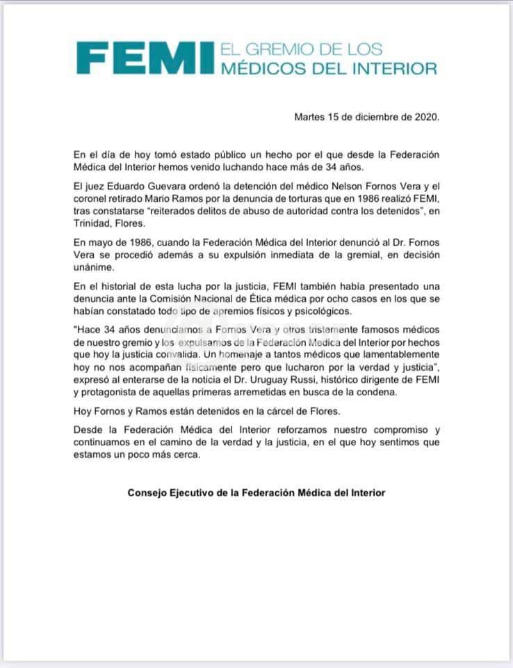 Ante el procesamiento de dos militares por "reiterados delitos de abuso de autoridad contra detenidos" por hechos ocurridos en 1986, la Federación Médica del Interior (FEMI) emitió un sentido comunicado recordado la prédica gremial en defensa de los Dererechos Humanos. Y e recuerdo a muchos médicos “que l...