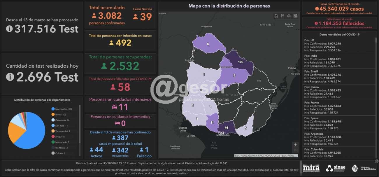 Este viernes 30 fueron analizadas 2.696 pruebas para la detección de COVID-19, que detectaron 39 casos de la enfermedad: 28 en Montevideo, 6 en Rivera, 3 en San José y 2 en Canelones, informó el Sistema Nacional de Emergencias (Sinae). Se mantienen los mismos brotes de los últimos días, añadió el ...