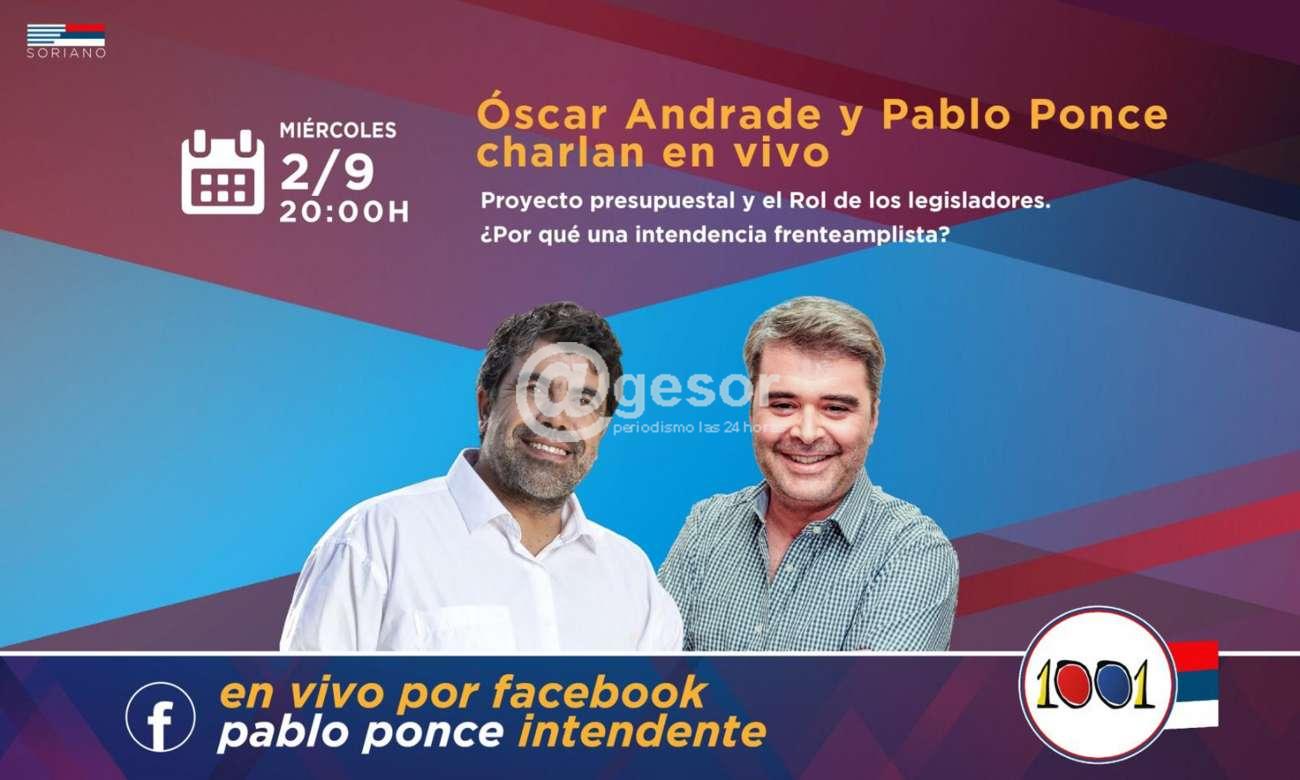 Este Miércoles 2 a las 20:30 hs, el Candidato a intendente Pablo Ponce, estará en diálogo en vivo con el Senador del Espacio 1001, Oscar Andrade, en la charla se abordarán los temas referidos al Proyecto presupuestal que estará en discusión en el parlamento y cuál será el rol de los legisla...