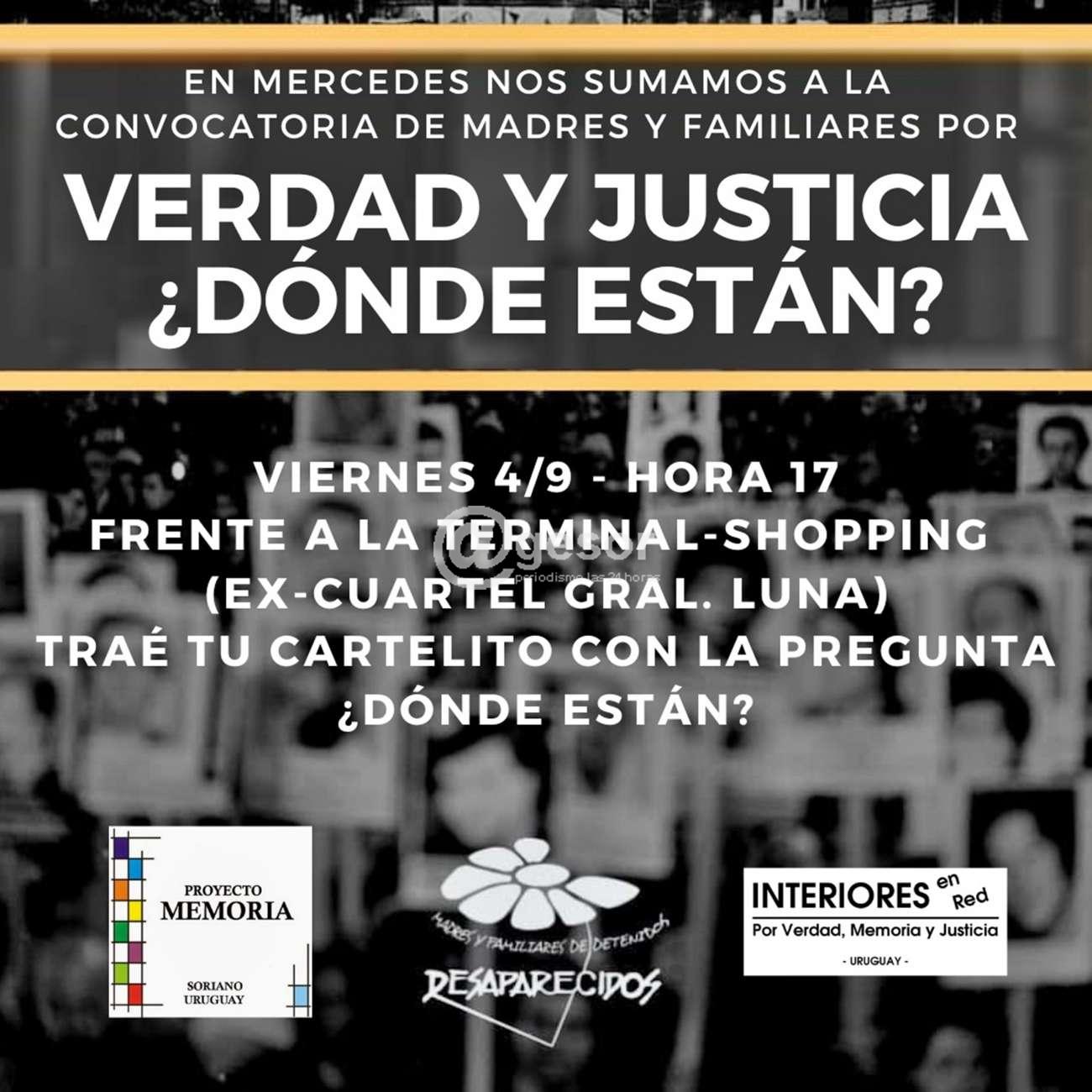 La Comisión Memoria, Justicia y contra la Impunidad de Soriano, realiza convocatoria en forma paralela a la que efectúa la organización Madres y Familiares de Detenidos Desaparecidos en Montevideo, y que también apoya Interiores en Red por Verdad, Memoria y Justicia. En el caso de Mercedes, la convocatoria es para las...