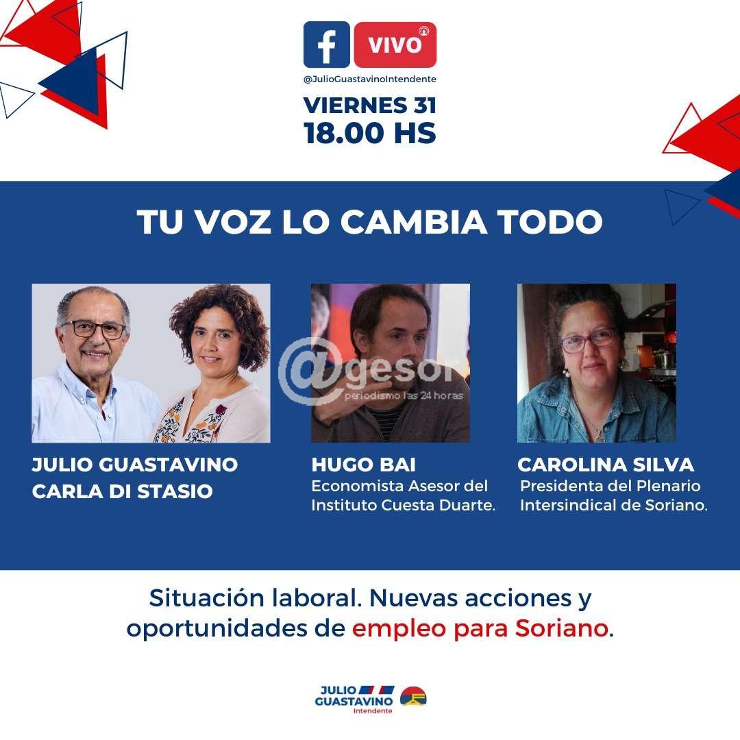 Este viernes 31 a partir de las 18.00 horas a través de Facebook vivo con el título "Tu voz lo cambia todo", el candidato a Intendente de Soriano por el Frente Amplio, Dr. Julio Guastavino Aguiar, junto a su suplente Arq. Carla Di Stasio, estarán compartiendo junto al Ec. Hugo Bai economista asesor del Instituto Cuesta Duart...