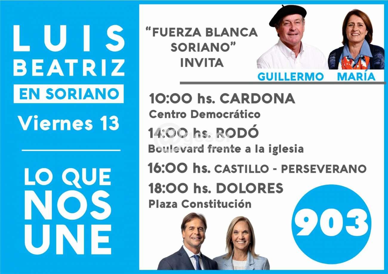 Este viernes 13 gira de Luis y Beatriz en SorianoA las 10.00 en CARDONA en Centro Democrático14.00 RODO bulevard frente a la Iglesia16.00 pueblo CASTILLO y PERSEVERANO18.00 DOLORES plaza ConstituciónLISTA 404: Carlos Aunchayna, José Luis Gómez, Sandra Rüsch, Wilson BrunEL EQUIP...