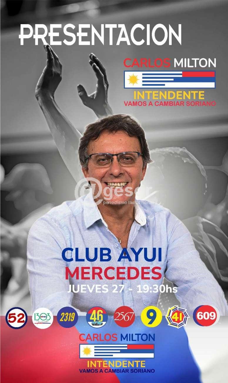 Carlos Milton Sorondo realizó la presentación de su candidatura a la Intendencia de Soriano. En un acto realizado en el Club Ayuí, de Mercedes y bajo una intensa lluvia, las listas frentistas que apoyan la candidatura de Carlos Milton Sorondo a la Intendencia de Soriano se congregaron en este acto rea...