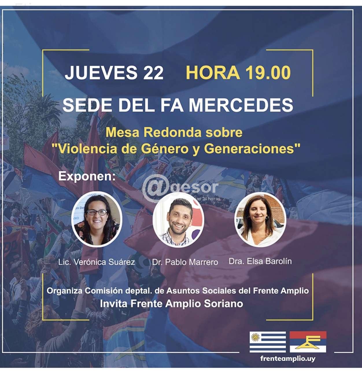 El Frente Amplio de Soriano organiza una mesa redonda sobre “Violencia de Género y Generaciones”. La misma estará a cargo de la Lic. Verónica Suárez, la Dra. Elsa Barolín y el Dr. Pablo Marrero. La misma se realizar&...