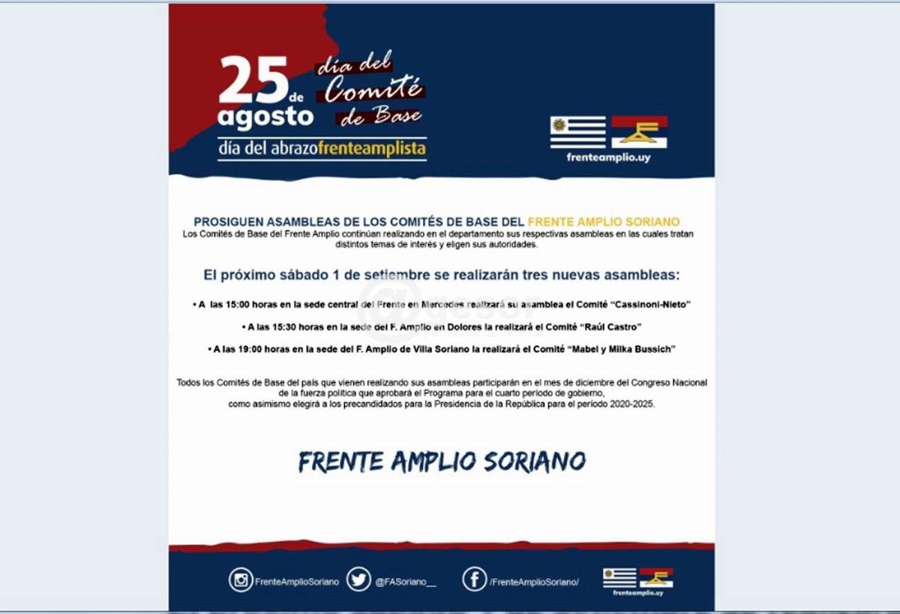 Los Comités de Base del Frente Amplio continúan realizando en el departamento sus respectivas asambleas en las cuales tratan distintos temas de interés y eligen sus autoridades. El próximo sábado 1 de setiembre se realizarán tres nuevas asambleas: A las 15:00 horas en la sede central del Frente en ...
