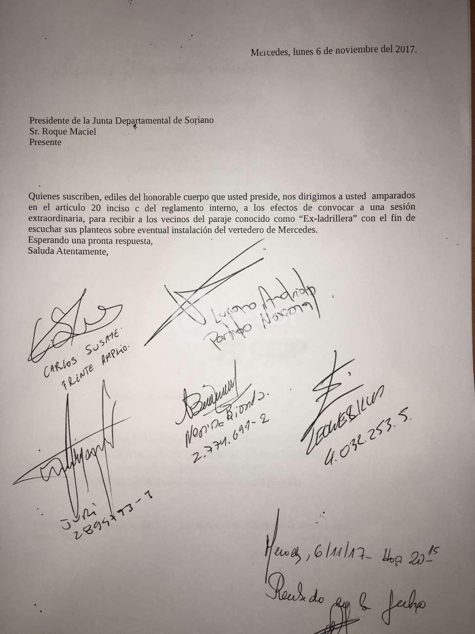 Los ediles Carlos Susaye (FA), Andrés Juri (PN), Luciano Andriolo (PN), Nerina Bionda (FA), y Leonel Silva (PC) pidieron se realice una sesión extraordinaria para tratar el planteo del traslado del vertedero a un predio cercano a la ex ladrillera.
