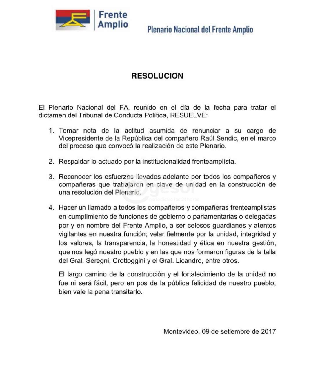 En el Plenario Nacional del Frente Amplio que se realiza en Montevideo, Raúl Sendic pidió la plabra y anunció su renuncia indeclinable a la Vicepresidencia de la República. Dijo sentirse dolido con “algunos compañeros del Frente Amplio” que pedían su renuncia por la prensa. “Frente a es...