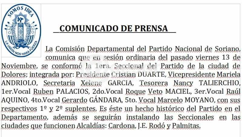 La Comisión Departamental del Partido Nacional de Soriano, comunica que en sesión ordinaria del pasado viernes 13 de Noviembre, se conformó la 1era. Seccional del Partido de la ciudad de Dolores; integrada por: Presidente Cristian DUARTE, Vicepresidente Mariela ANDRIOLO, Secretaria Xelene GARCIA, Tesorera Nancy TALIERCHIO, 1...