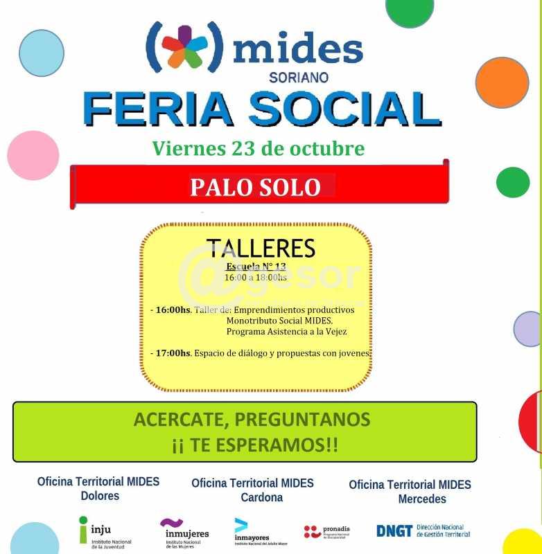 El viernes 23 en Palo Solo estará realizándose la Feria Social Mides que consta de talleres sobre temáticas de interés y demanda de la población e instancias de consulta sobre programas de éste ministerio. Ambas actividades son para público en general.